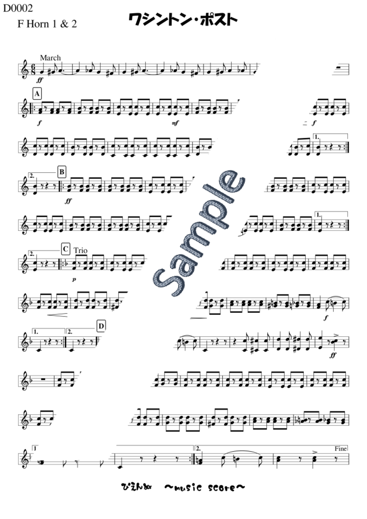 「マーチ王」ジョン・フィリップ・スーザ作曲の「ワシントン・ポスト」(The Washington Post)の吹奏楽編成楽譜です。6/8拍子で書かれたこの曲は、スーザが作曲した曲の中で有名な曲の一つとなっています。冒頭のメロディは、一度はどこかで聞いたことがあるのではないでしょうか?