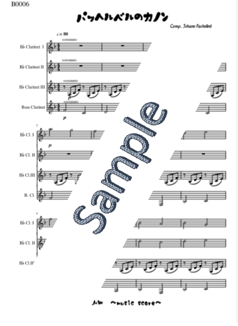 パッヘルベルのカノンのクラリネットアンサンブルです。クラリネット3本とバスクラリネットでお楽しみいただけます。3つのクラリネットが全く同じ旋律を追唱し、そこに低音部が加わります。楽器をはじめてから、ある程度力がついてきた方におすすめです。